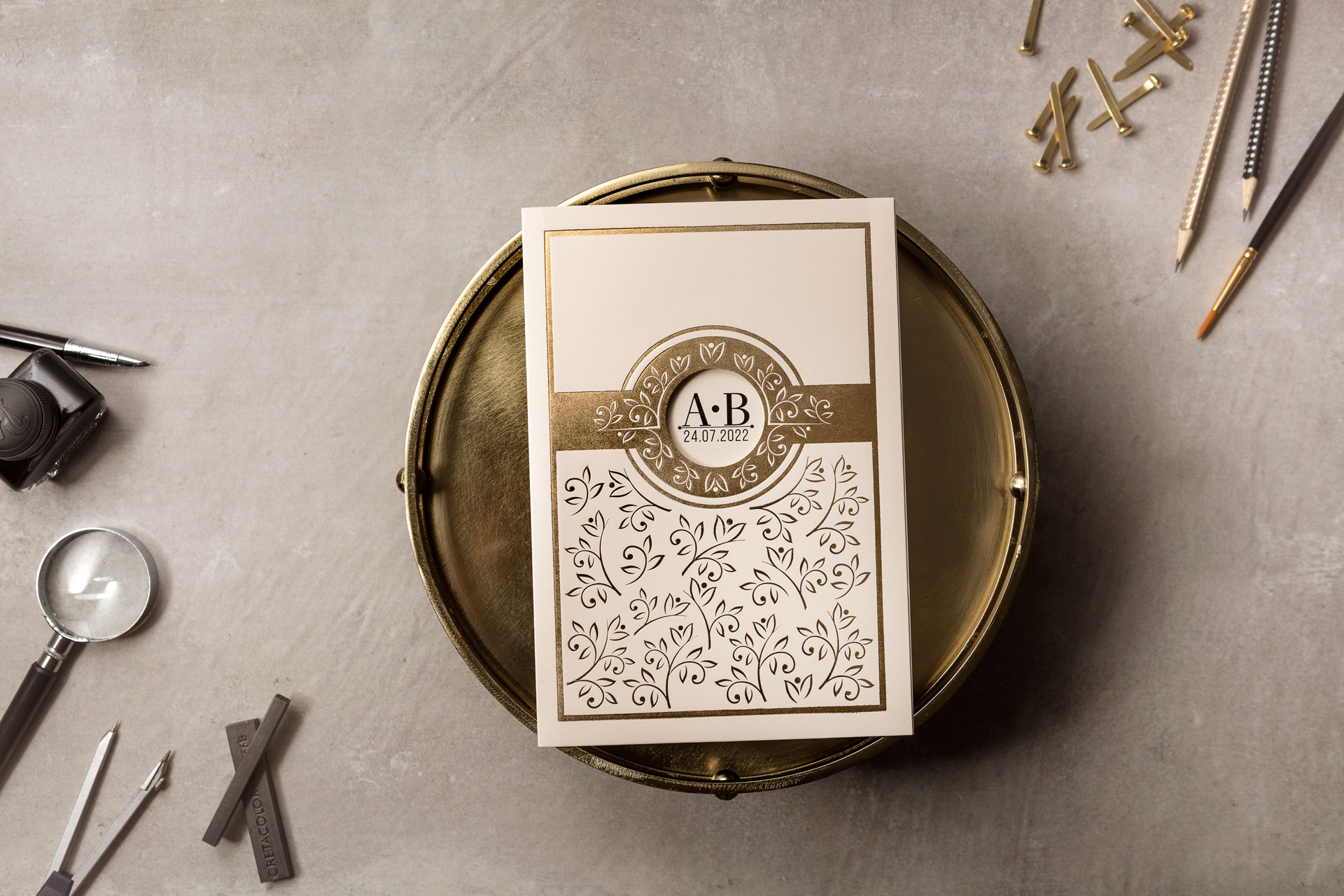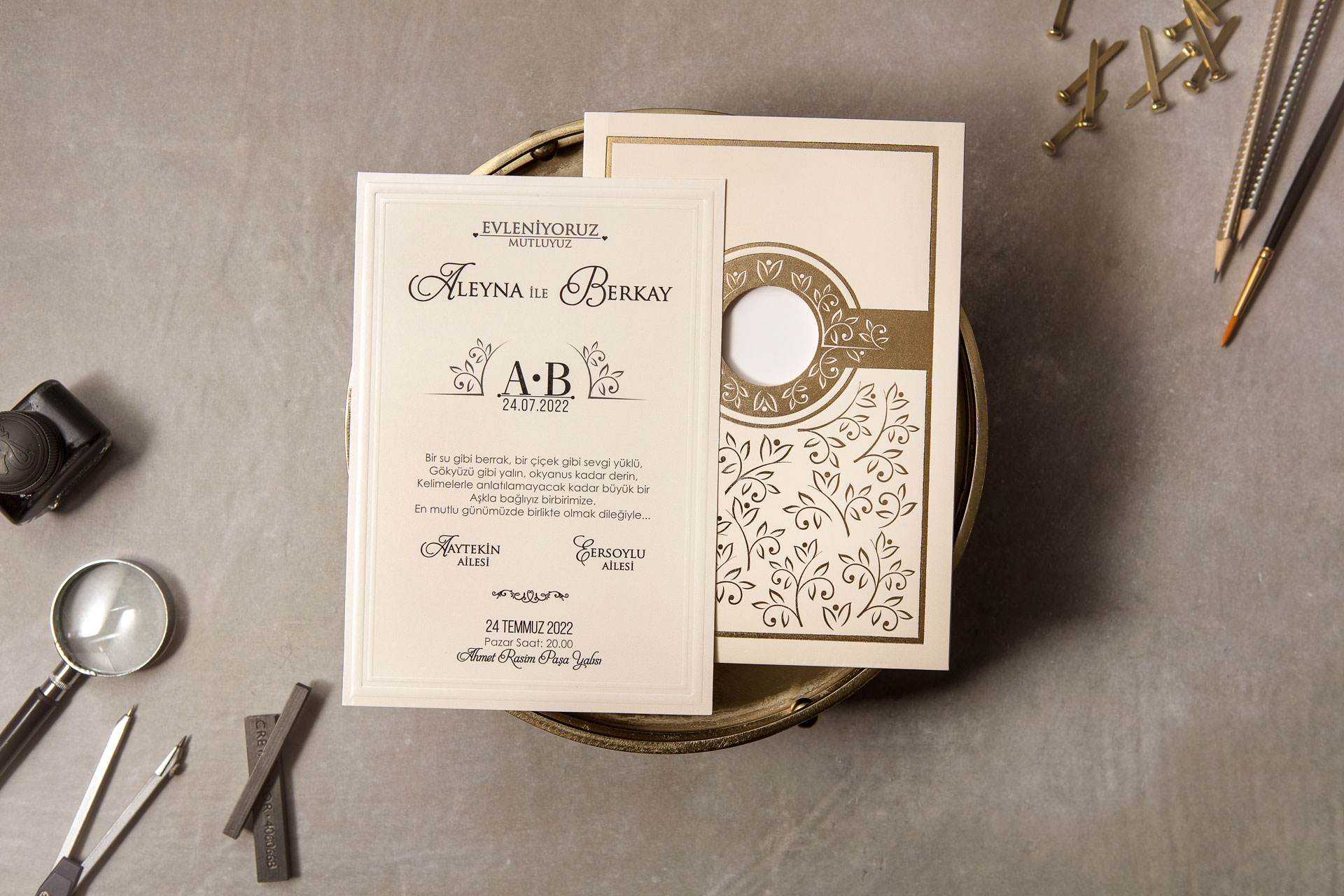 8390 davetiye modeli, modern ve şık tasarımıyla özel günlerinize prestij katıyor. Dış kılıfındaki altın varak detaylar, zarif bir dokunuş eklerken, sade iç tasarım şıklığı vurgular. Hem minimalist hem de etkileyici bir davet için ideal bir seçim olan bu model, zarafeti ön planda tutan çiftler için mükemmel bir tercihtir.